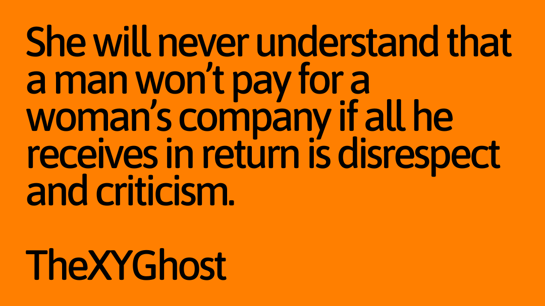 She will never understand that a man won’t pay for a woman’s company if all he receives in return is disrespect and criticism.