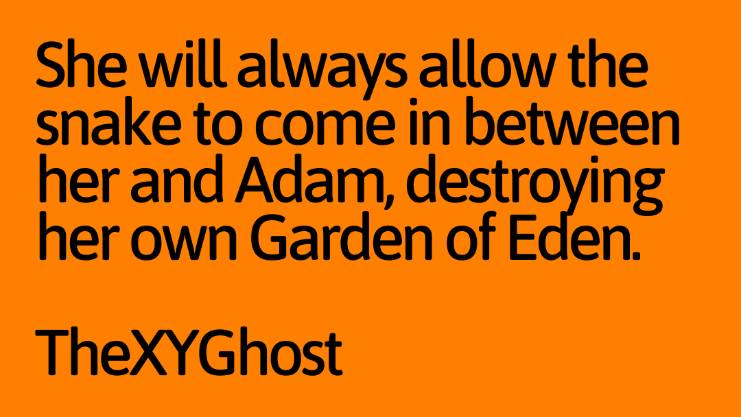 She will always allow the snake to come in between her and Adam, destroying her own Garden of Eden.