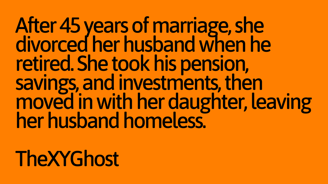After 45 years of marriage, she divorced her husband when he retired. She took his pension, savings, and investments, then moved in with her daughter, leaving her husband homeless.