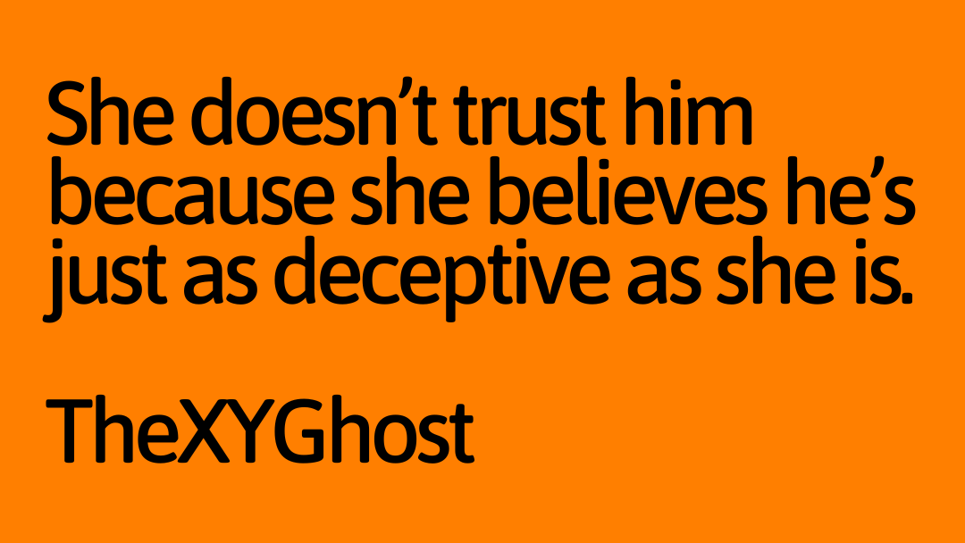 She doesn’t trust him because she believes he’s just as deceptive as she is.