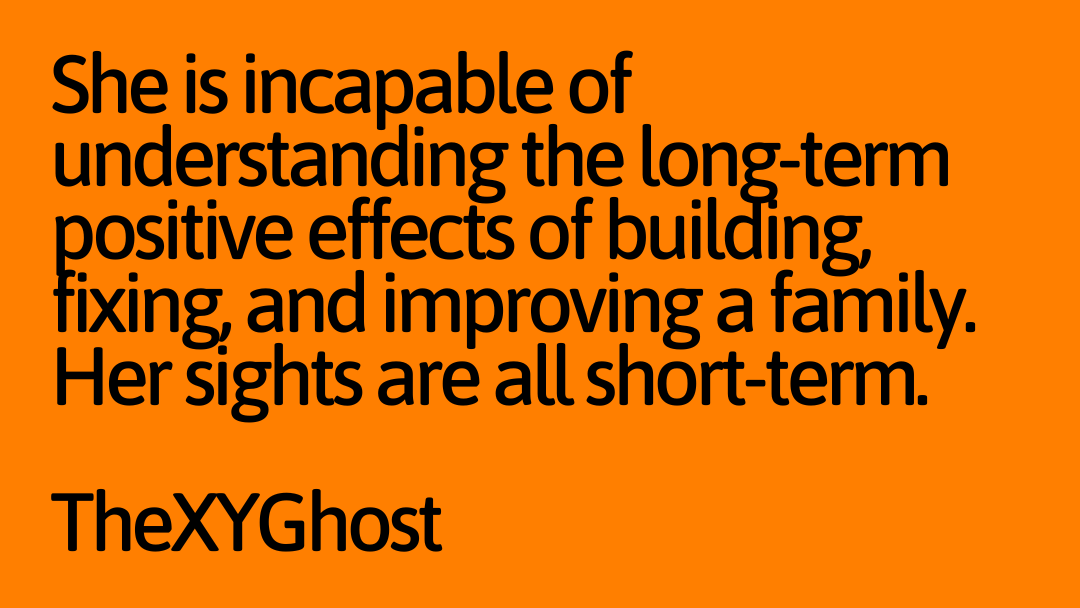 She is incapable of understanding the long-term positive effects of building, fixing, and improving a family. Her sights are all short-term.