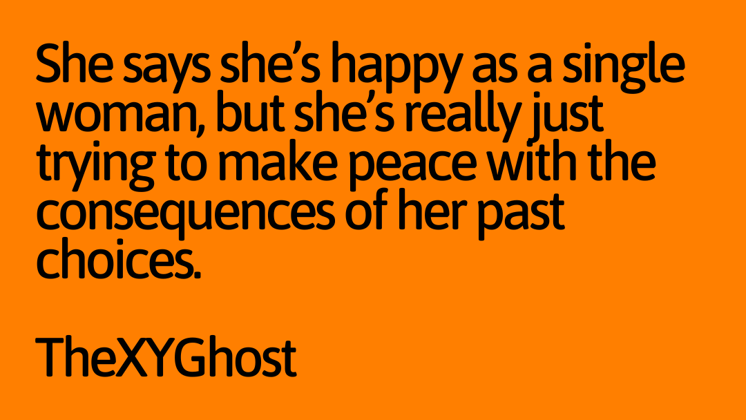 She says she’s happy as a single woman, but she’s really just trying to make peace with the consequences of her past choices.