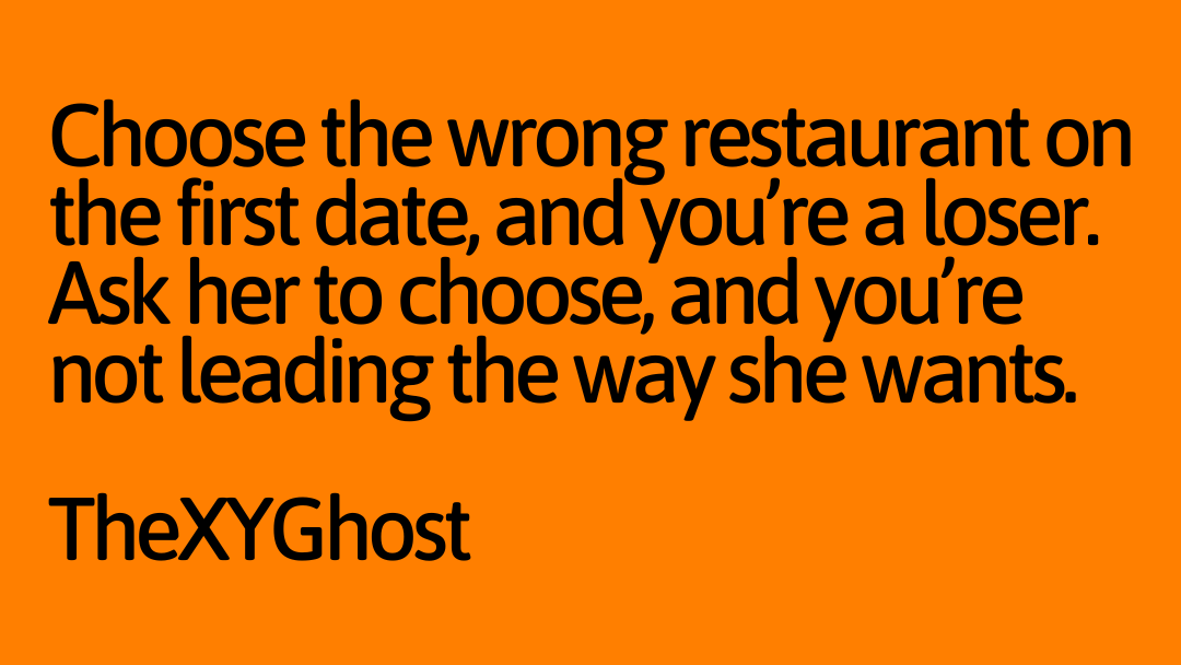Choose the wrong restaurant on the first date, and you’re a loser. Ask her to choose, and you’re not leading the way she wants.