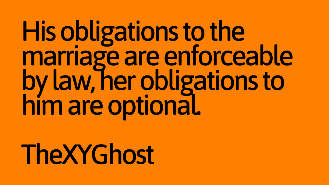 His obligations to the marriage are enforceable by law, her obligations to him are optional.