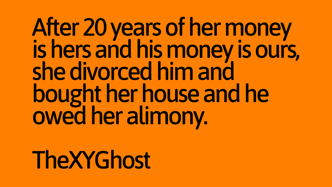 After 20 years of her money is hers and his money is ours, she divorced him and bought her house and he owed her alimony.