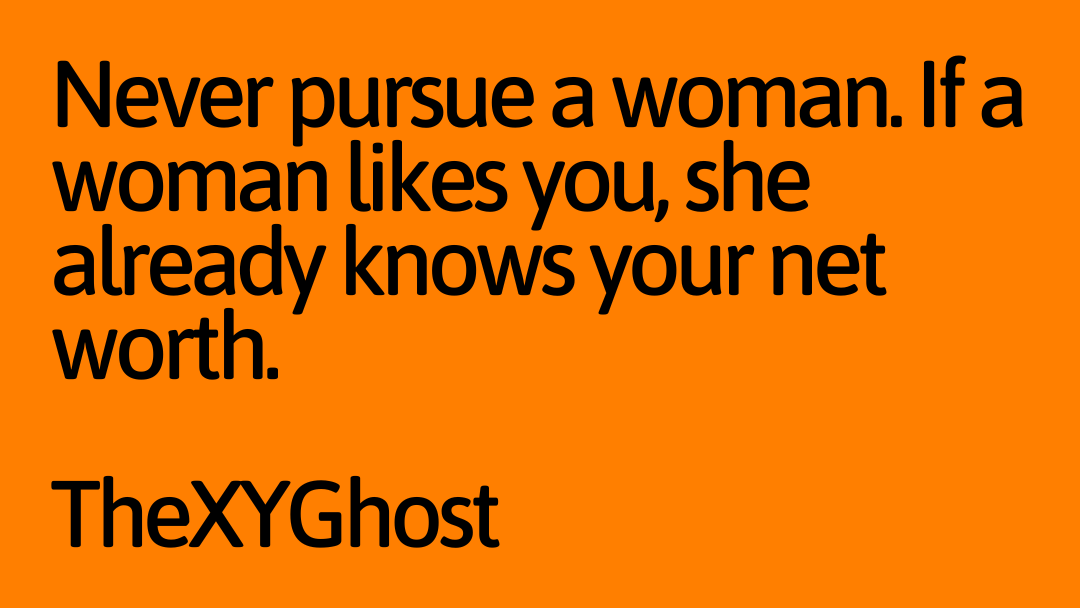 Never pursue a woman. If a woman likes you, she already knows your net worth.