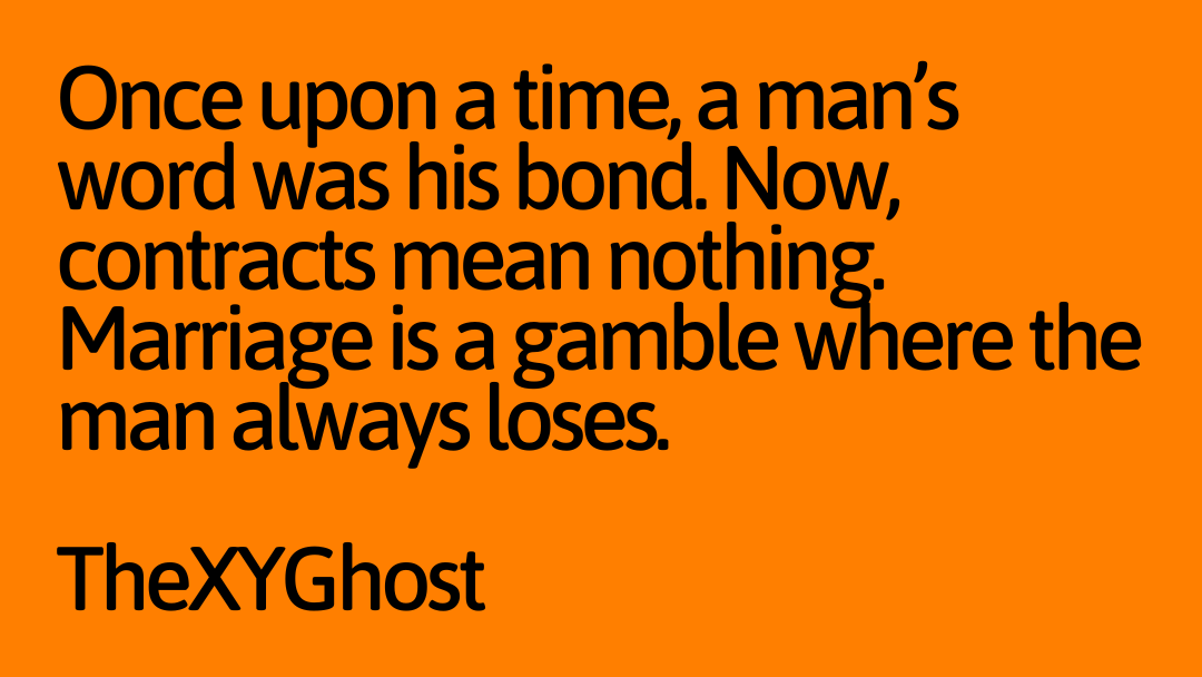 Once upon a time, a man’s word was his bond. Now, contracts mean nothing. Marriage is a gamble where the man always loses.
