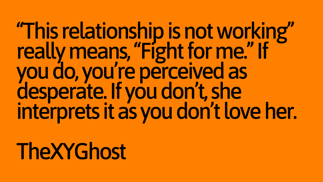 “This relationship is not working” really means, “Fight for me.” If you do, you’re perceived as desperate. If you don’t, she interprets it as you don’t love her.