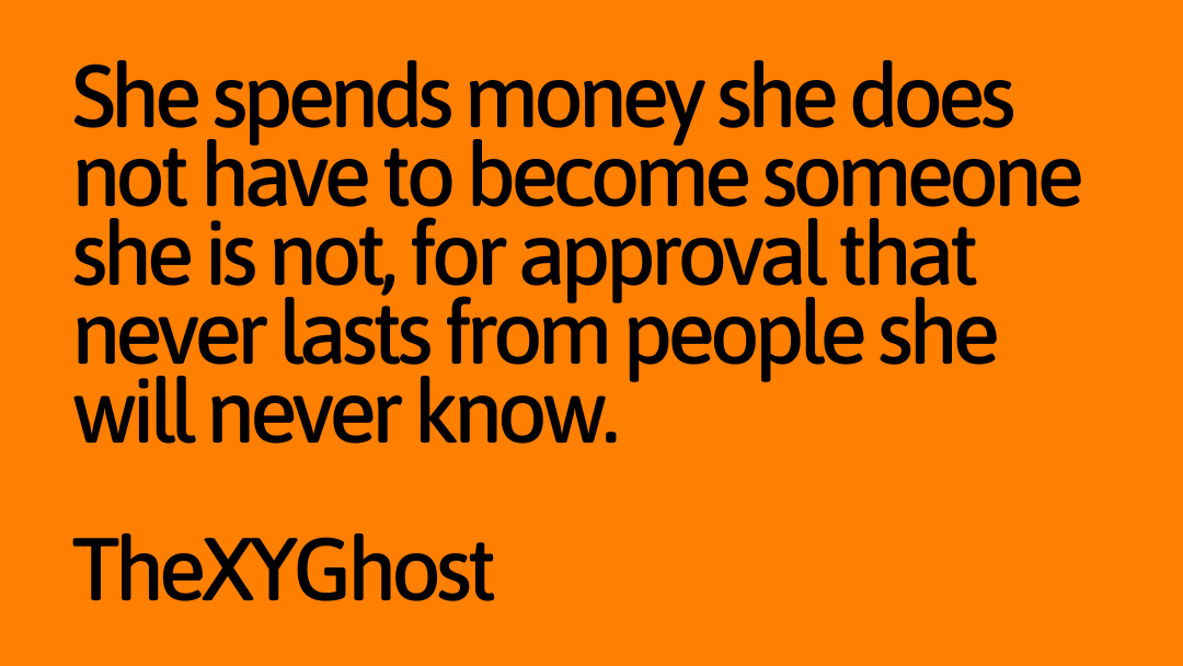 She spends money she does not have to become someone she is not, for approval that never lasts from people she will never know.