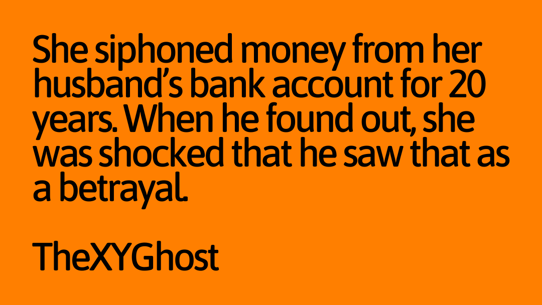 She siphoned money from her husband’s bank account for 20 years. When he found out, she was shocked that he saw that as a betrayal.