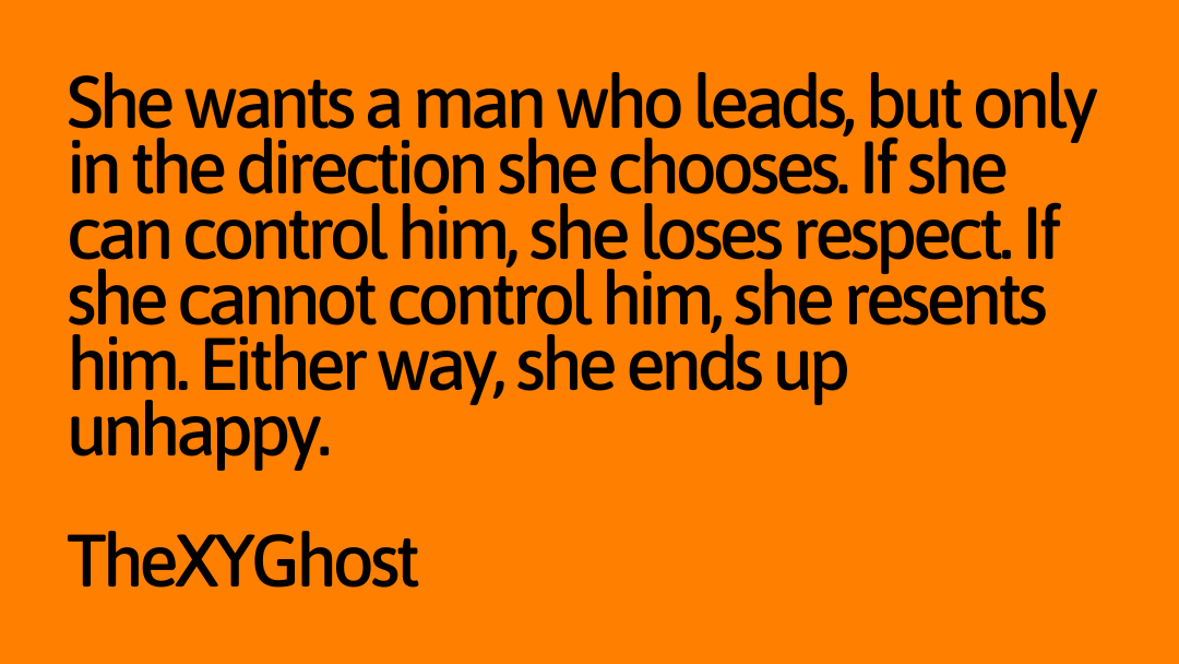 She wants a man who leads, but only in the direction she chooses. If she can control him, she loses respect. If she cannot control him, she resents him. Either way, she ends up unhappy.