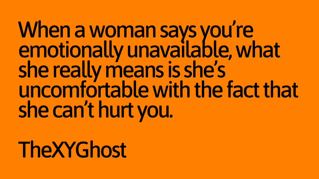 When a woman says you’re emotionally unavailable, what she really means is she’s uncomfortable with the fact that she can’t hurt you.