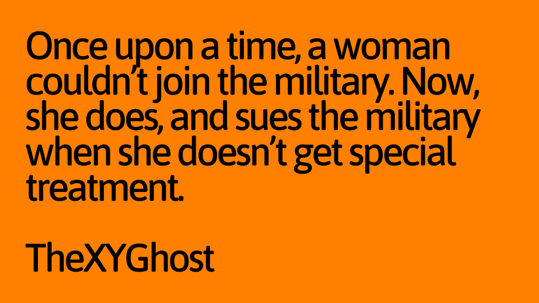 Once upon a time, a woman couldn’t join the military. Now, she does, and sues the military when she doesn’t get special treatment.
