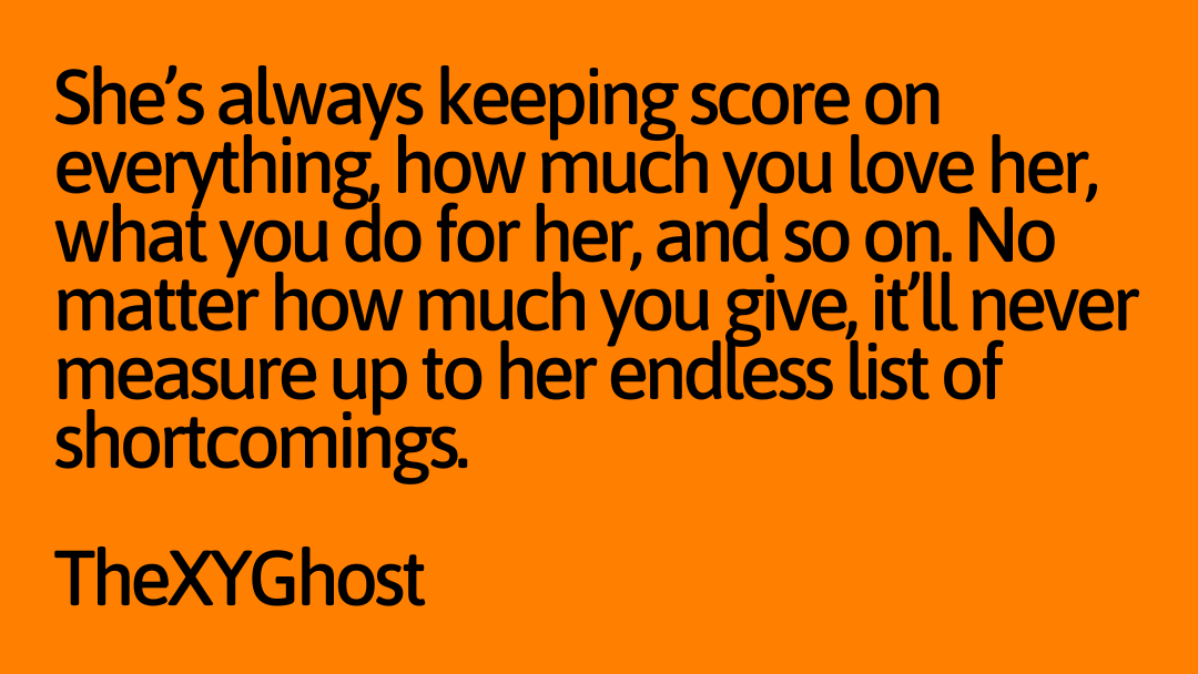 She’s always keeping score on everything, how much you love her, what you do for her, and so on. No matter how much you give, it’ll never measure up to her endless list of shortcomings.